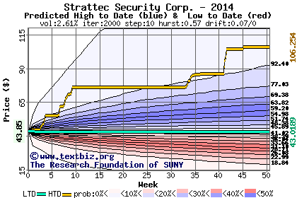 The high to date and low to date prices of the stock plotted against a random walk model for 2014 (what's this?).
