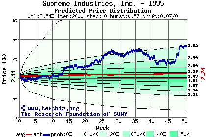 The high to date and low to date prices of the stock plotted against a random walk model for 1995 (what's this?).