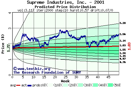 The high to date and low to date prices of the stock plotted against a random walk model for 2001 (what's this?).
