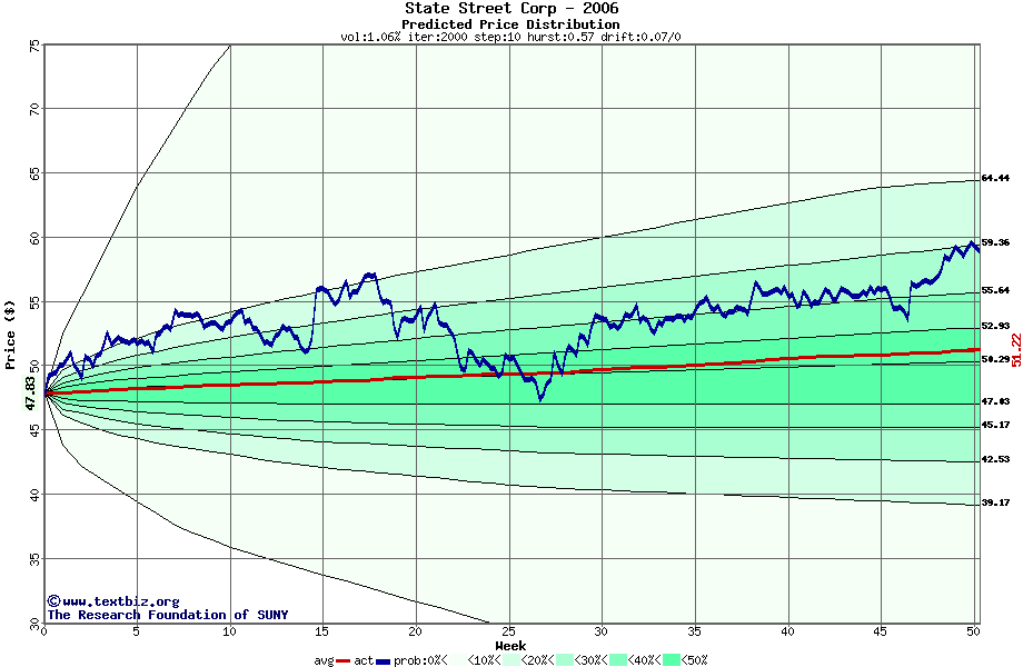 The following graph plots the year-to-date performance of the stock for 2006 compared to the probability calculated by a random walk model.
