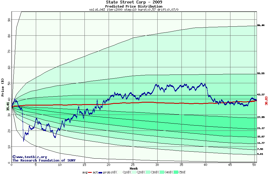 The following graph plots the year-to-date performance of the stock for 2009 compared to the probability calculated by a random walk model.
