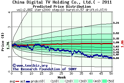 The high to date and low to date prices of the stock plotted against a random walk model for 2011 (what's this?).