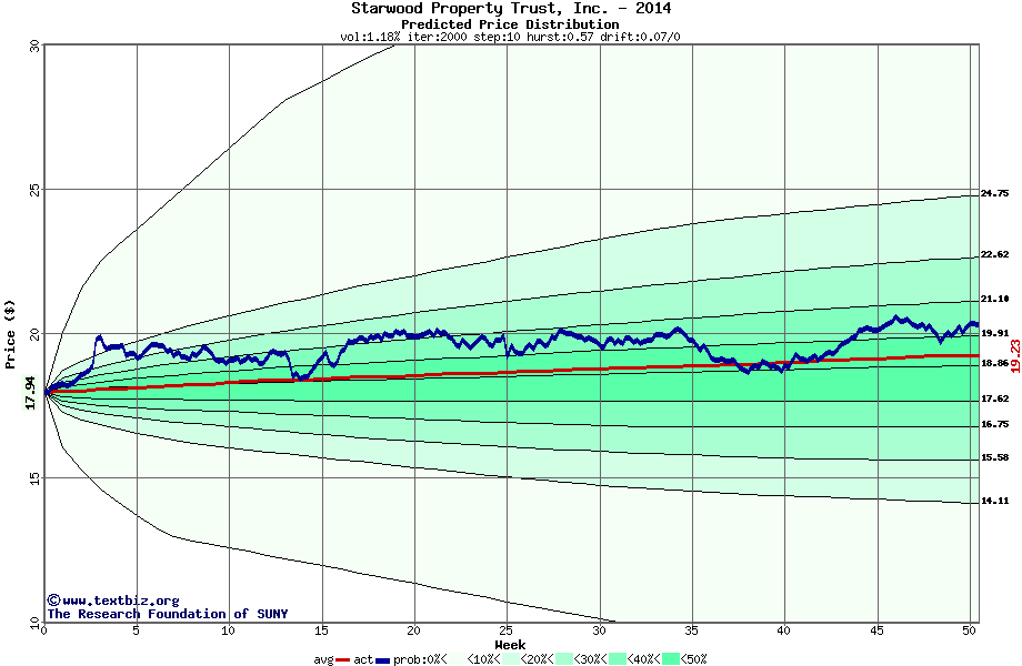 The following graph plots the year-to-date performance of the stock for 2014 compared to the probability calculated by a random walk model.