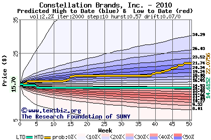 The high to date and low to date prices of the stock plotted against a random walk model for 2010 (what's this?).