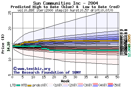 The high to date and low to date prices of the stock plotted against a random walk model for 2004 (what's this?).