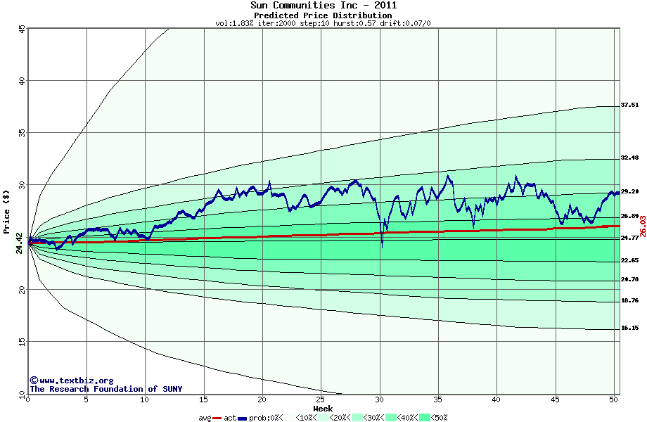 The following graph plots the year-to-date performance of the stock for 2011 compared to the probability calculated by a random walk model.