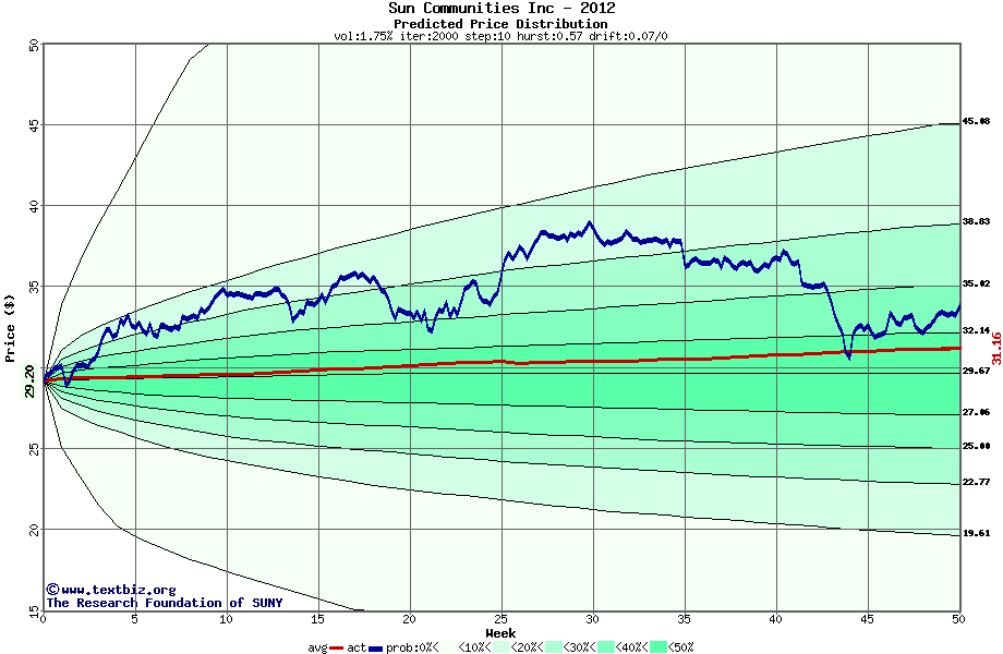 The following graph plots the year-to-date performance of the stock for 2012 compared to the probability calculated by a random walk model.