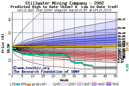 The high to date and low to date prices of the stock plotted against a random walk model for 2002 (what's this?).
