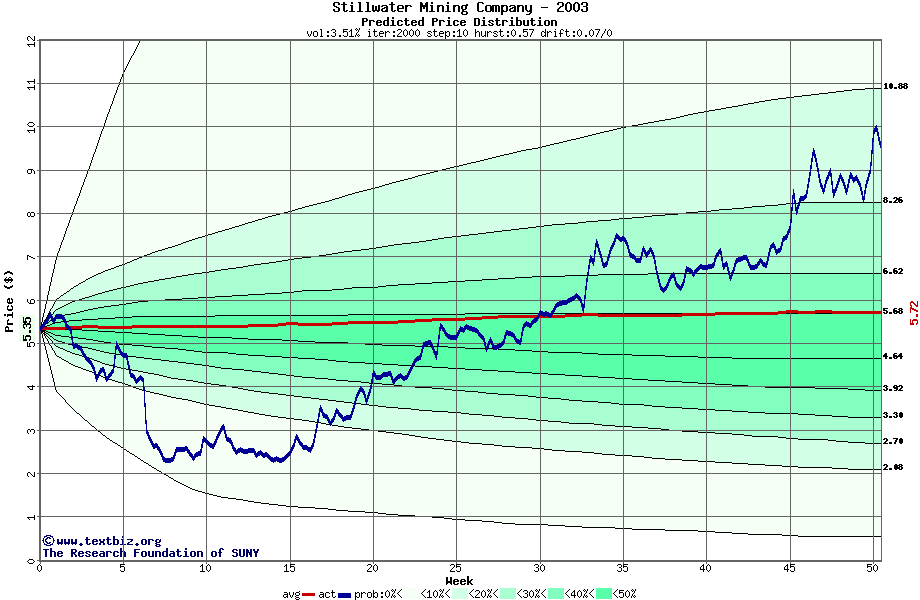The following graph plots the year-to-date performance of the stock for 2003 compared to the probability calculated by a random walk model.
