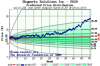 The following graph plots the year-to-date performance of the stock for 2010 compared to the probability calculated by a random walk model.