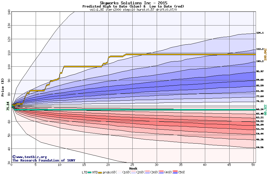 The following graph plots the year-to-date performance of the stock for 2015 compared to the probability calculated by a random walk model.