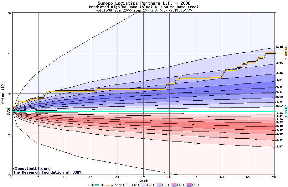 The high to date and low to date prices of the stock plotted against a random walk model for 2006 (what's this?).