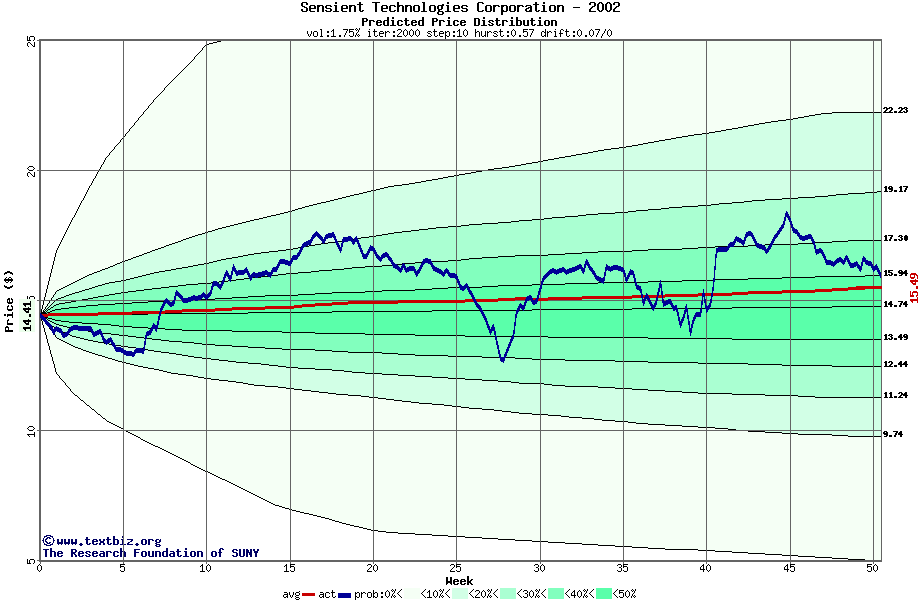 The following graph plots the year-to-date performance of the stock for 2002 compared to the probability calculated by a random walk model.