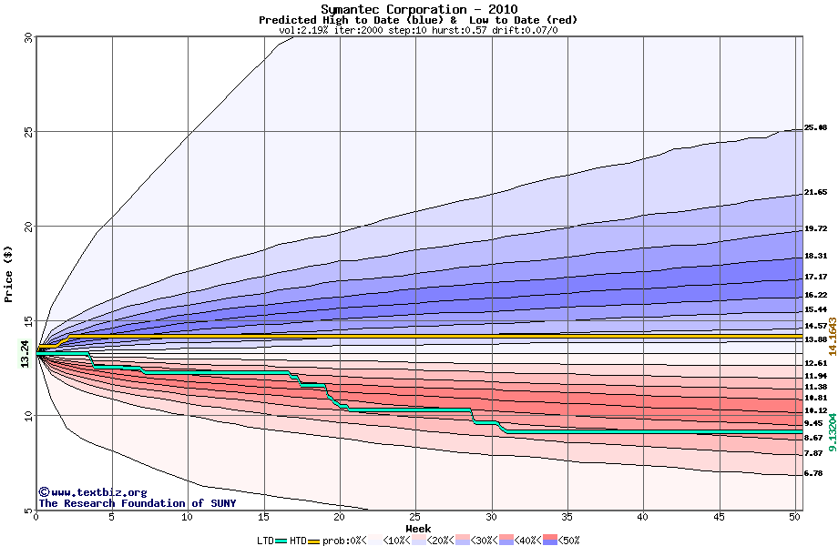 The high to date and low to date prices of the stock plotted against a random walk model for 2010 (what's this?).