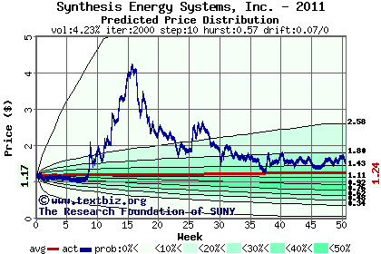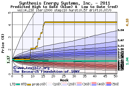 The high to date and low to date prices of the stock plotted against a random walk model for 2011 (what's this?).