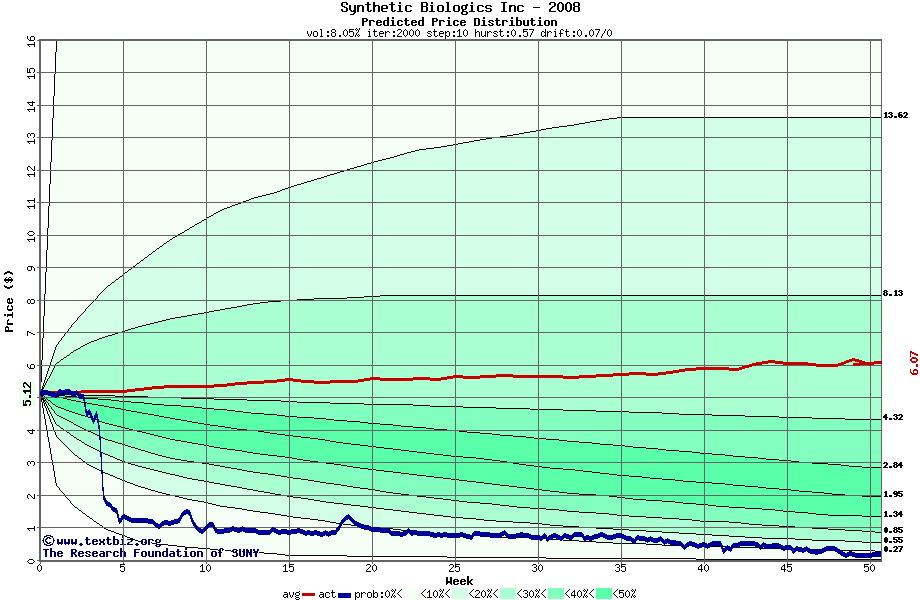 The high to date and low to date prices of the stock plotted against a random walk model for 2008 (what's this?).