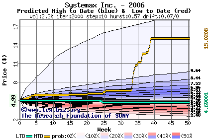 The high to date and low to date prices of the stock plotted against a random walk model for 2006 (what's this?).