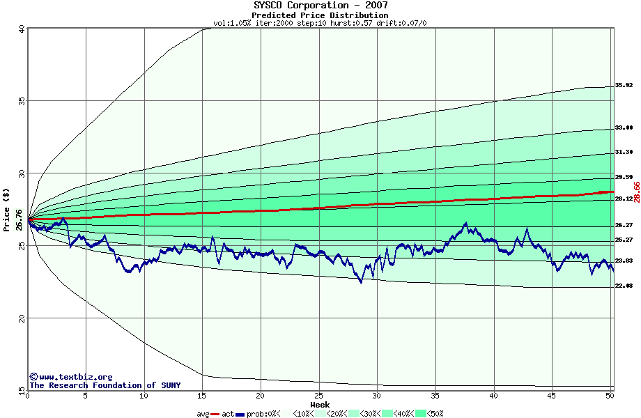 The following graph plots the year-to-date performance of the stock for 2007 compared to the probability calculated by a random walk model.
