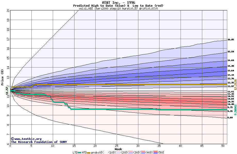 The high to date and low to date prices of the stock plotted against a random walk model for 1996 (what's this?).