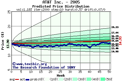 The following graph plots the year-to-date performance of the stock for 2005 compared to the probability calculated by a random walk model.