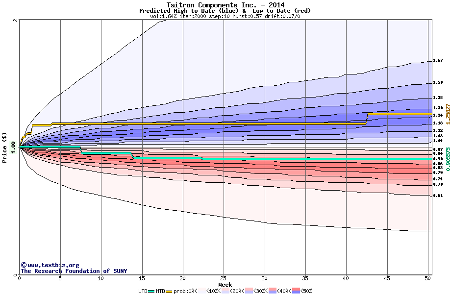 The high to date and low to date prices of the stock plotted against a random walk model for 2014 (what's this?).