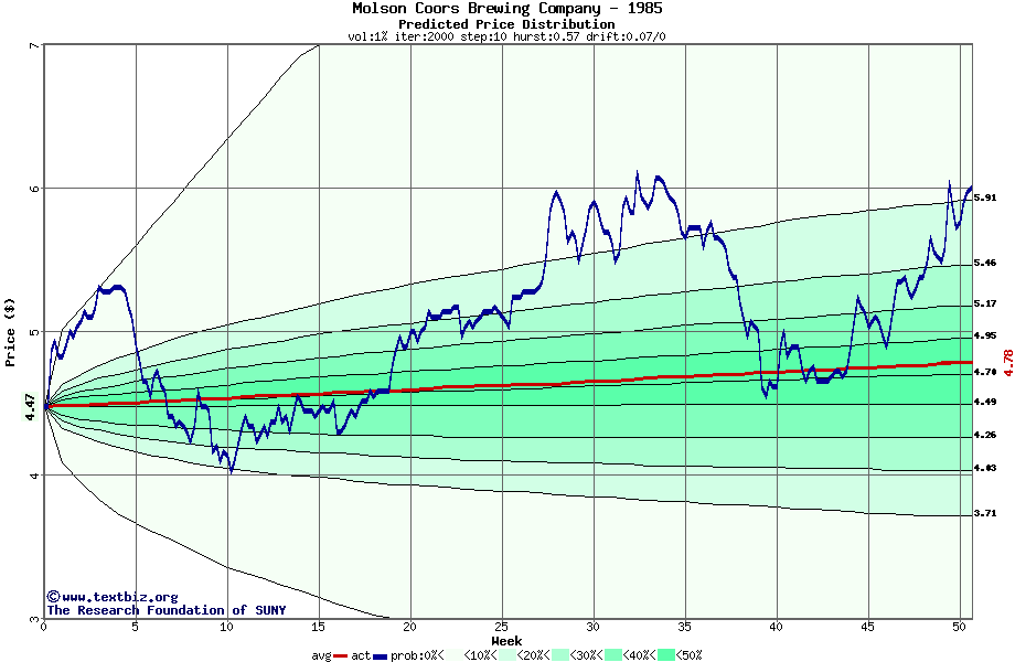 The following graph plots the year-to-date performance of the stock for 1985 compared to the probability calculated by a random walk model.