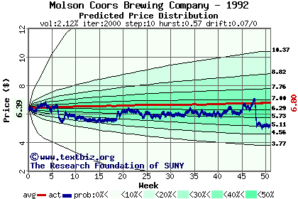 The high to date and low to date prices of the stock plotted against a random walk model for 1992 (what's this?).