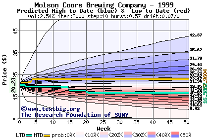 The high to date and low to date prices of the stock plotted against a random walk model for 1999 (what's this?).