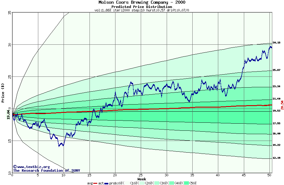 The high to date and low to date prices of the stock plotted against a random walk model for 2000 (what's this?).
