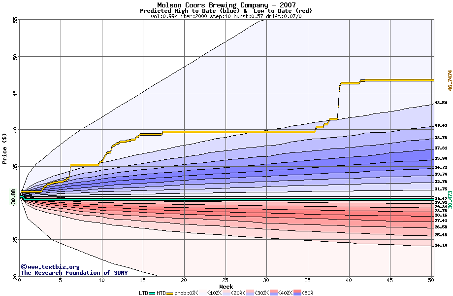 The high to date and low to date prices of the stock plotted against a random walk model for 2007 (what's this?).