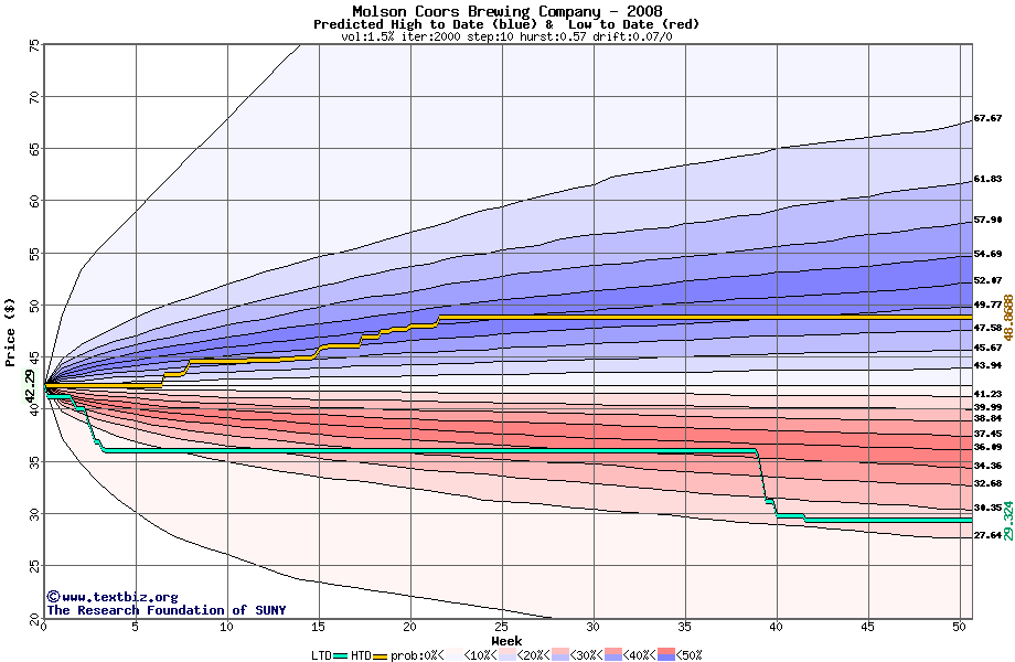The high to date and low to date prices of the stock plotted against a random walk model for 2008 (what's this?).