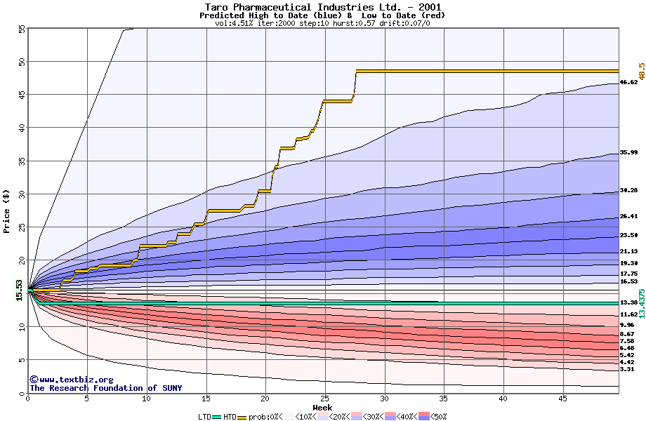 The high to date and low to date prices of the stock plotted against a random walk model for 2001 (what's this?).