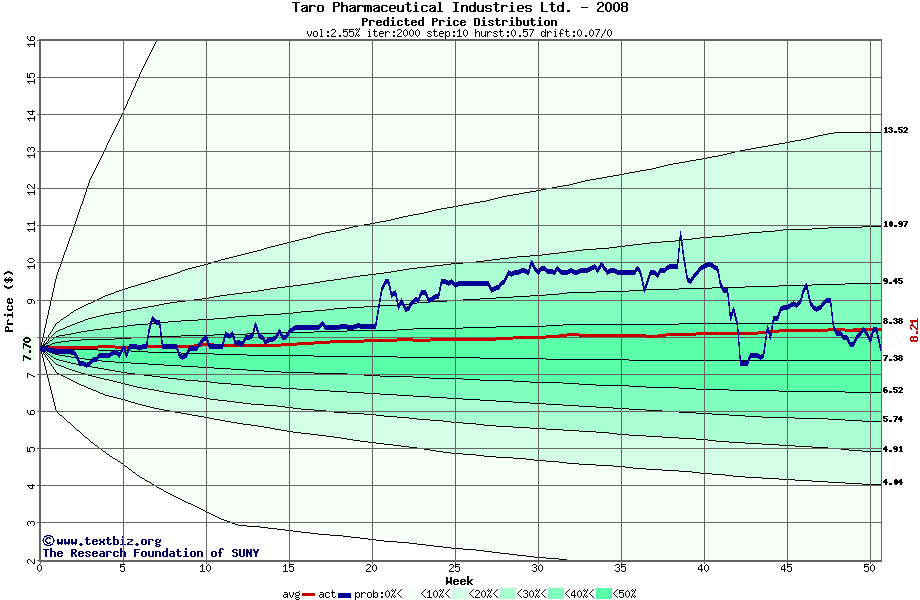 The following graph plots the year-to-date performance of the stock for 2008 compared to the probability calculated by a random walk model.