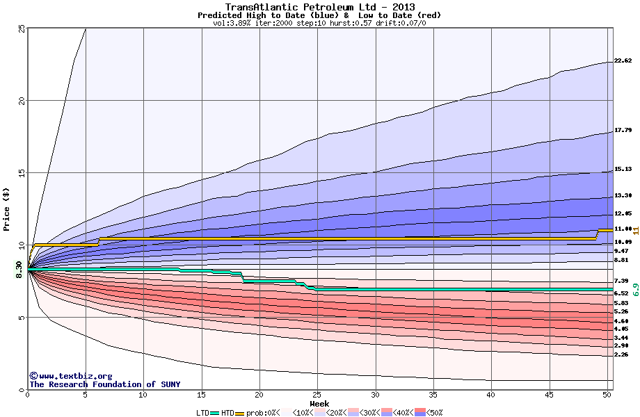 The high to date and low to date prices of the stock plotted against a random walk model for 2013 (what's this?).