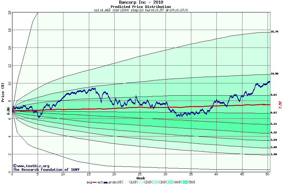 The following graph plots the year-to-date performance of the stock for 2010 compared to the probability calculated by a random walk model.