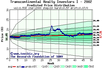 The high to date and low to date prices of the stock plotted against a random walk model for 2002 (what's this?).