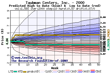 The high to date and low to date prices of the stock plotted against a random walk model for 2000 (what's this?).
