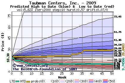 The high to date and low to date prices of the stock plotted against a random walk model for 2009 (what's this?).