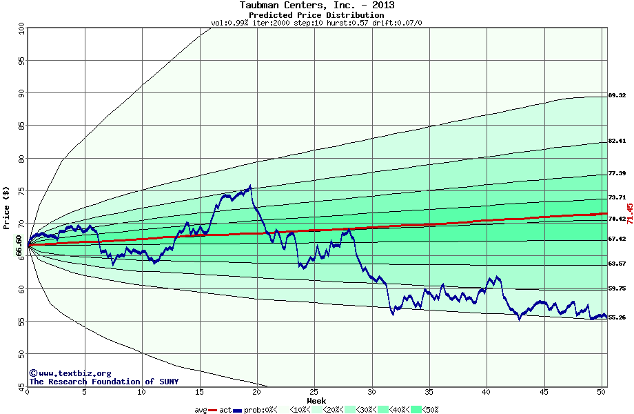 The following graph plots the year-to-date performance of the stock for 2013 compared to the probability calculated by a random walk model.