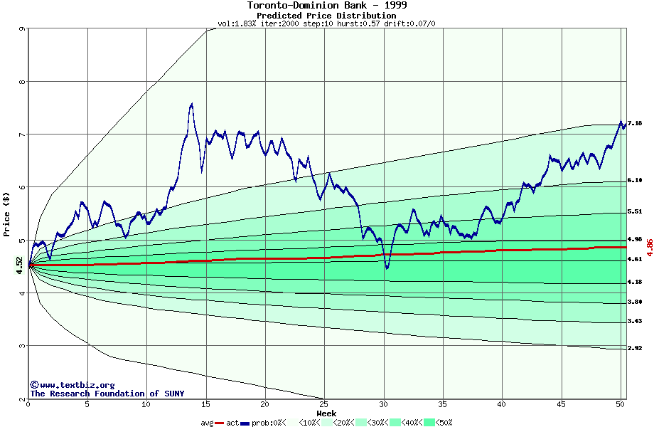 The high to date and low to date prices of the stock plotted against a random walk model for 1999 (what's this?).