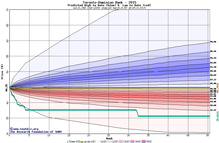 The high to date and low to date prices of the stock plotted against a random walk model for 2015 (what's this?).