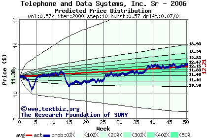 The high to date and low to date prices of the stock plotted against a random walk model for 2006 (what's this?).
