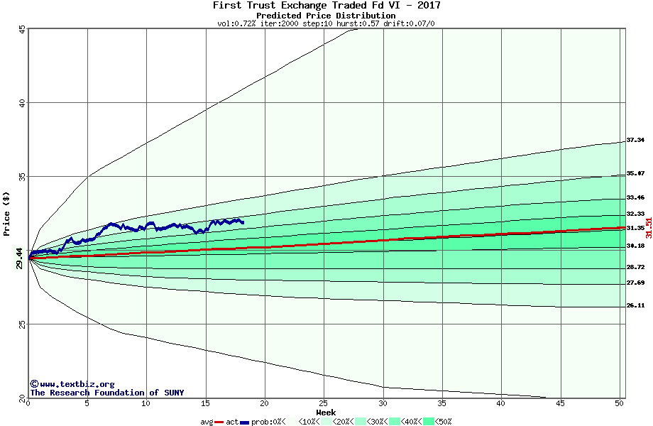The following graph plots the year-to-date performance of the stock for 2017 compared to the probability calculated by a random walk model.