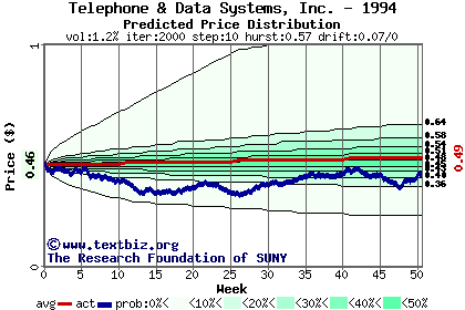The high to date and low to date prices of the stock plotted against a random walk model for 1994 (what's this?).
