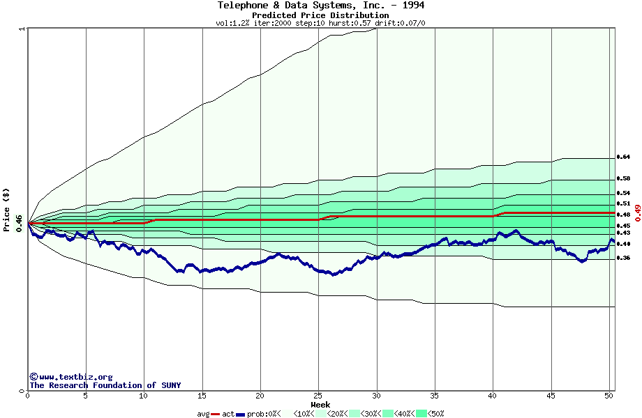 The following graph plots the year-to-date performance of the stock for 1994 compared to the probability calculated by a random walk model.