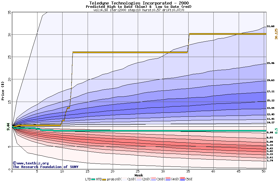 The high to date and low to date prices of the stock plotted against a random walk model for 2000 (what's this?).