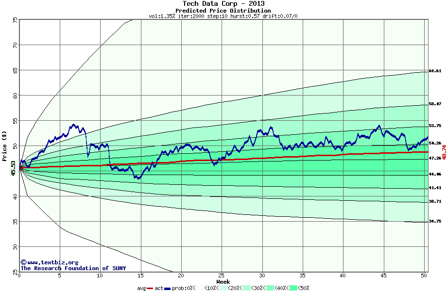 The following graph plots the year-to-date performance of the stock for 2013 compared to the probability calculated by a random walk model.