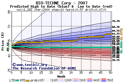 The high to date and low to date prices of the stock plotted against a random walk model for 2007 (what's this?).