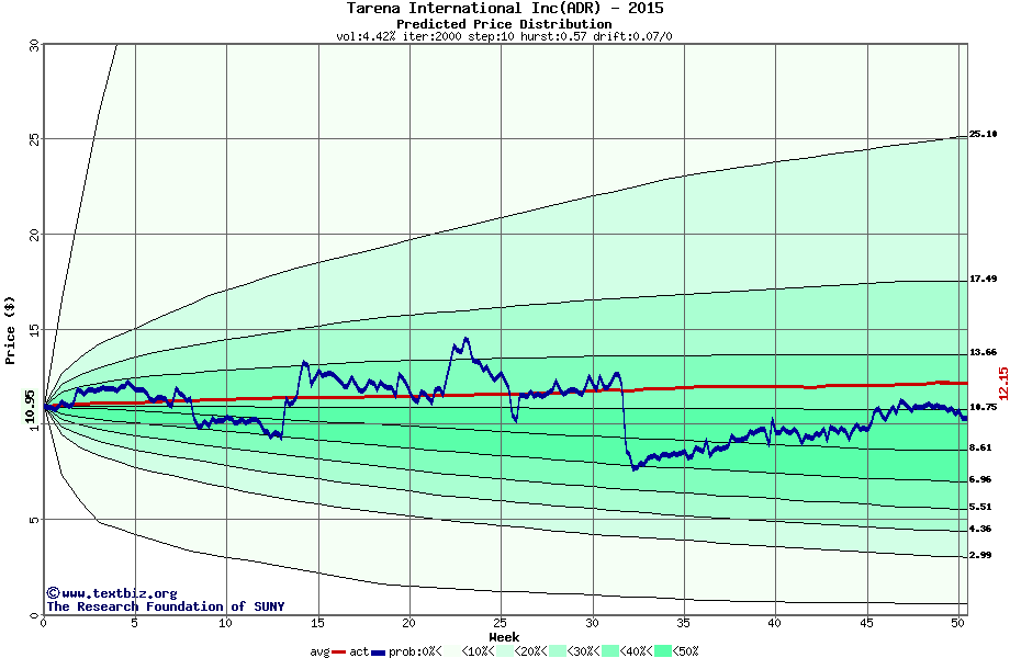 The following graph plots the year-to-date performance of the stock for 2015 compared to the probability calculated by a random walk model.