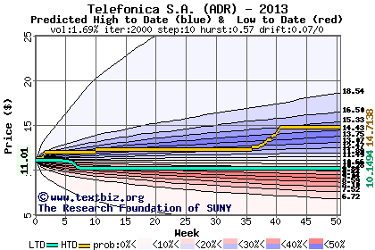 The high to date and low to date prices of the stock plotted against a random walk model for 2013 (what's this?).